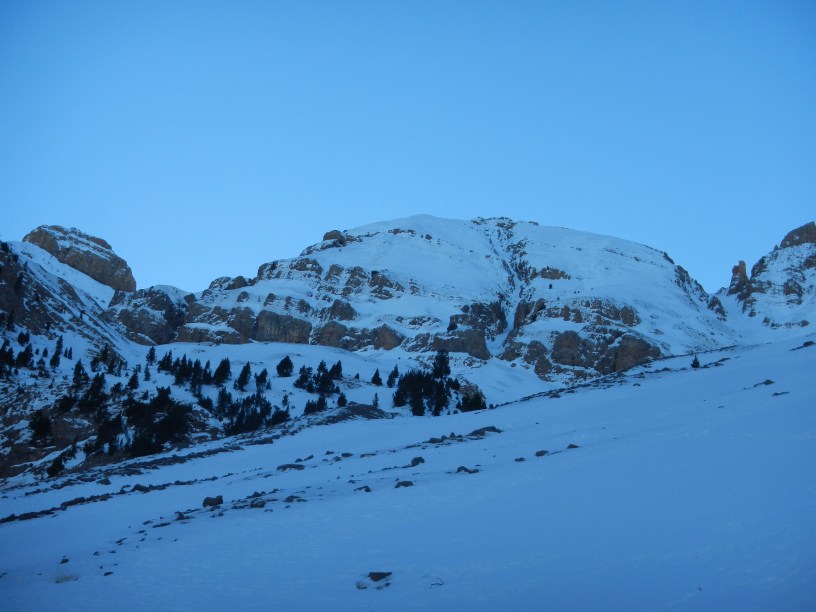 Bonito y solitario entorno, por lo menos en esta época del año, que ofrece otros corredores interesantes, como la gran diagonal del Pico D’Espouy, 250m PD+, o el corredor norte de la Peña de Liatse, 400m D+