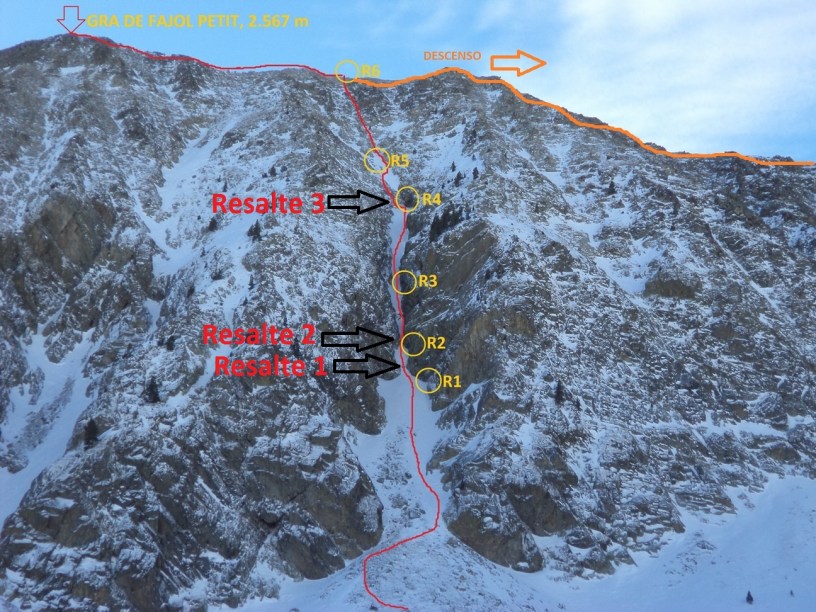 Giramos entonces en dirección norte cruzando una de las pistas de esquí y buscamos el mejor camino para llegar a la base del corredor. Ascendemos el cono de deyección y en la parte derecha podemos montar una reunión(R1) para asegurar el primer resalte, mixto a 55º.