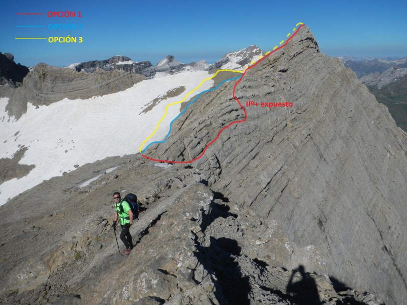 1-OPCIÓN 1, la que seguimos nosotros: Buscar una vira aérea que surca la parte francesa, para realizar una trepada de IIº+ a la izquierda siguiendo los hitos. Hay que estar atentos a los hitos y no continuar por la vira.