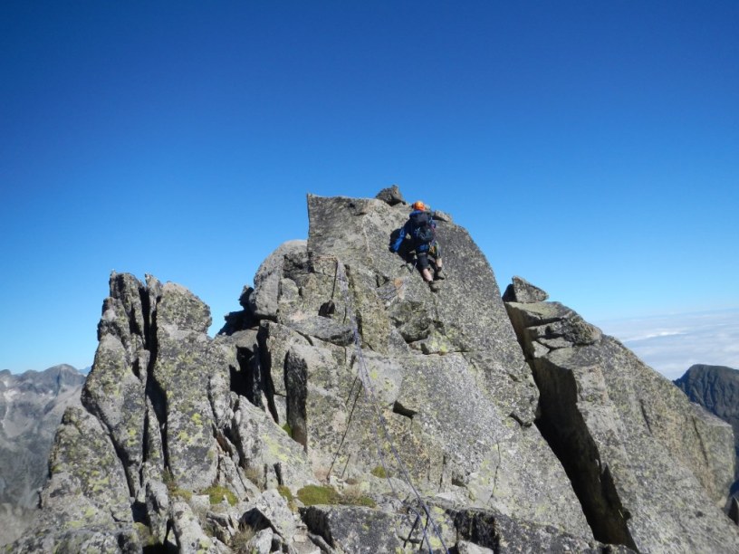 Una vez en la cresta, avanzaremos fácil por ella hasta una pequeña brecha donde se encuentra el paso clave de la jornada, el PASO DE HOMBROS, que da acceso a la cumbre del PICO MIR. Se trata de un paso de 4 metros de V+ /6a (2 pasos) expuesto en la parte izquierda.