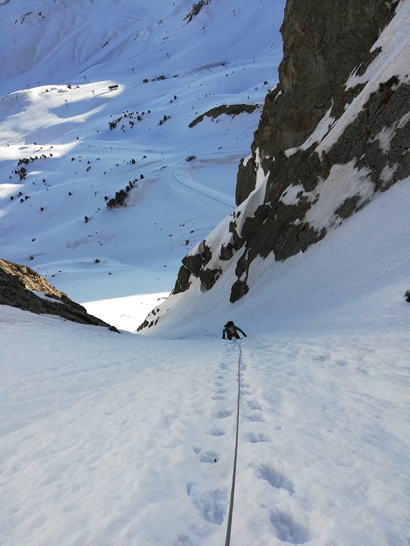Comenzamos el corredor primero a unos 40º y luego a 45º con la nieve dura, que permite ascender con facilidad.