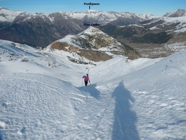 La nieve está muy endurecida, lo que dificulta el ascenso en algunos tramos. No debemos llegar al telesilla que asciende a Gallinero, lo dejaremos a nuestra derecha.