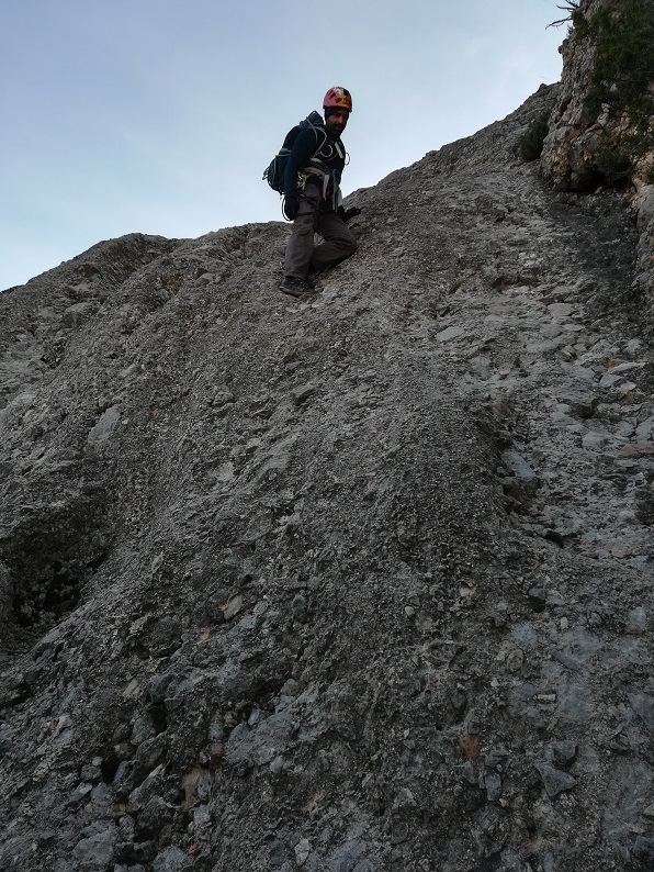 Iniciamos un poco a la izquierda del espolón, hasta que llegaremos a un tramo descompuesto. No tocarlo y seguir entonces un poco por la derecha del espolón, limpio y con buenas posibilidades de aseguramiento. La reunión se encuentra en una cómoda terraza.
