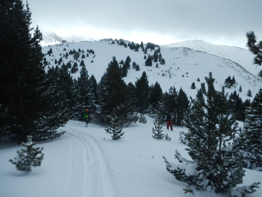 Descenderemos una pala más inclinada, buscando diagonales, para llegar a una zona de bosque.