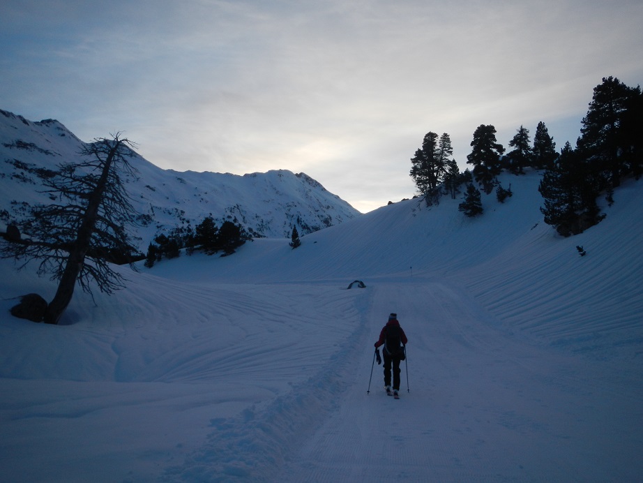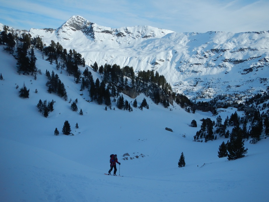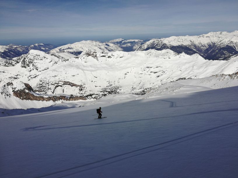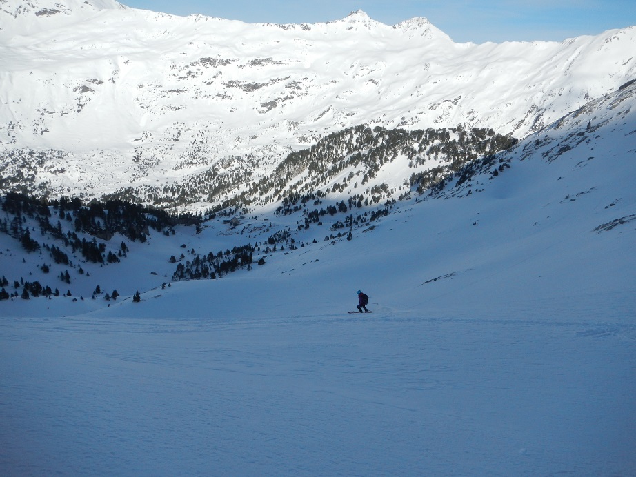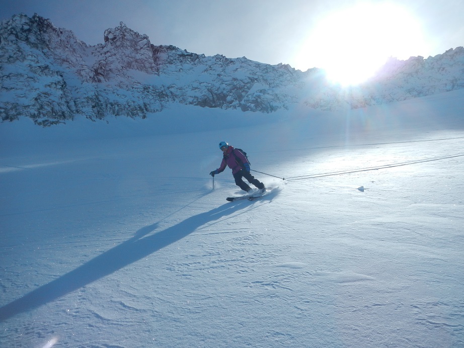 Una vez abajo, volvemos a calzar esquís para bajar esquiando a placer unos mil metros de desnivel hasta el refugio de la Renclusa.