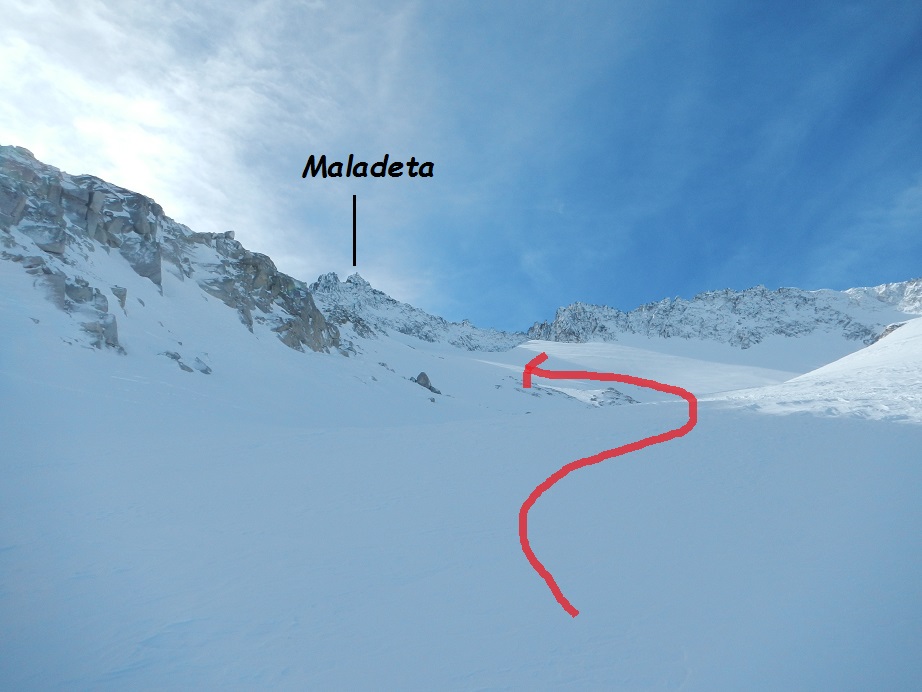 Entramos en el glaciar de la Maladeta y en el fondo destaca el oblicuo corredor.