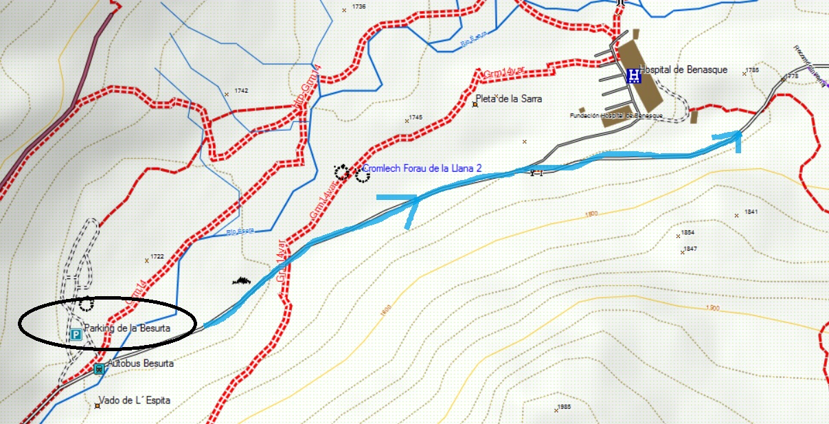 Cruzamos el pueblo de Benasque y seguimos la carretera A-139 hasta prácticamente su final, donde un desvío a la derecha nos llevará a los Llanos del Hospital. Aparcamos antes de llegar al hotel en un parking público a nuestra izquierda, antes de una caseta de madera.