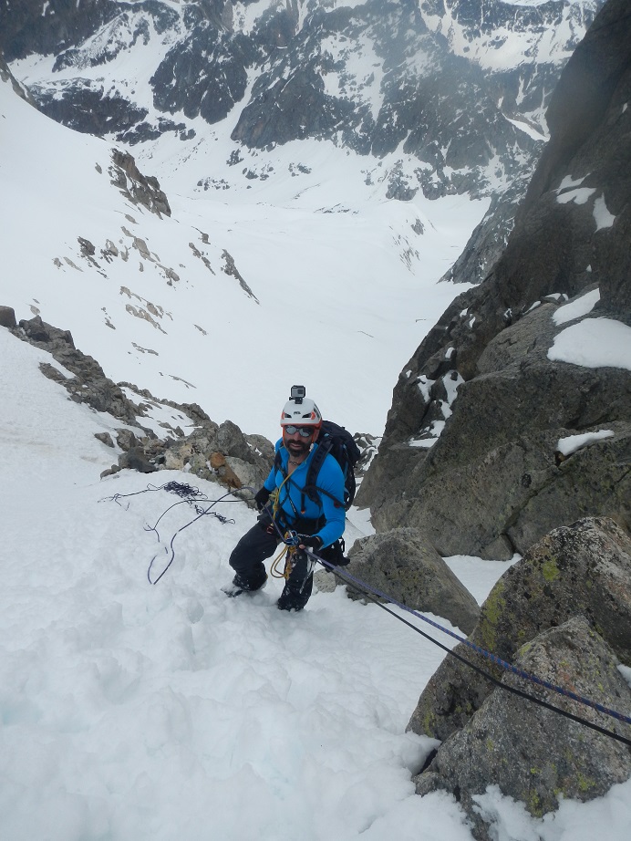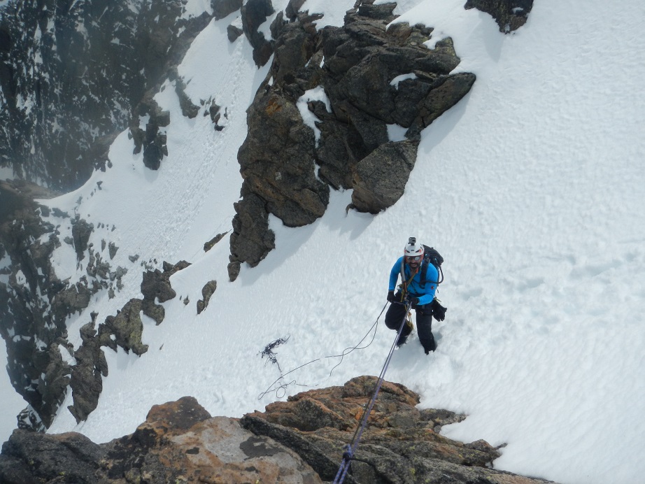 MATERIAL: Cuerda de 30m y cordino auxiliar para recuperar en los rápeles, 2 tornillos de hielo cortos, aros de cinta, cintas express largas, cordino para abandonar, crampones, piolets y material de seguridad invernal.