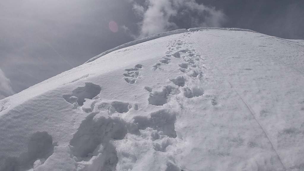 Para iniciar el descenso no lo hacemos por la cornisa y arista de nieve que hemos ascendido. Lo realizaremos tomando la linea recta del corredor. Para ello, desde el vértice geodésico, caminaremos unos metros hacia el norte.