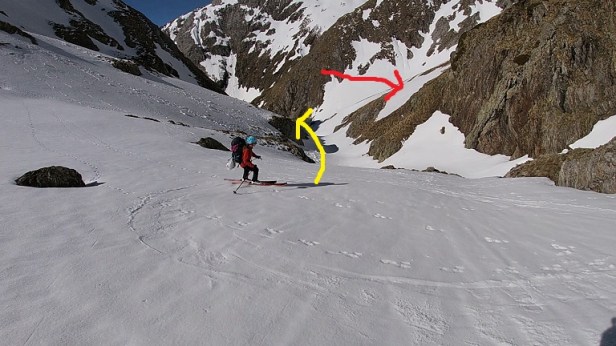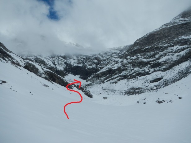 Llegamos a un punto en el que tendremos que descender unos metros y atravesar un llano para tomar el GR. A la derecha del mismo continúa el barranco, algo menos encajonado, por donde también se podría ascender y por donde descenderemos en la bajada. Valoraremos las opciones según sobre todo el riesgo de aludes.