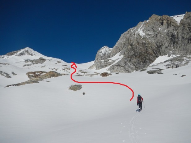 Atravesada la vira ya podremos calzar esquís. Avanzamos sin ganar mucha altura entrando en un pequeño circo. En este punto tomamos el GR de verano, que nos obliga a descalzar esquís. A la derecha del GR hay un barranco que permite el ascenso foqueando, por el cual descenderemos en la bajada, pero en días con riesgo de aludes puede resultar peligroso. Además avanzada la temporada comenzarán a aparecer grietas de deshielo.