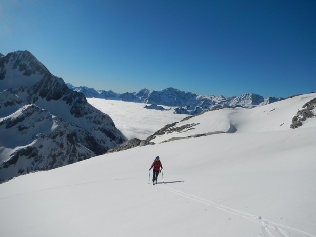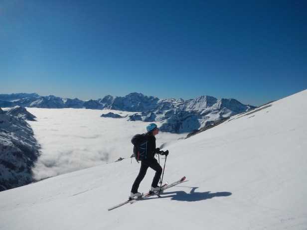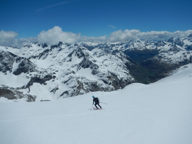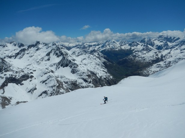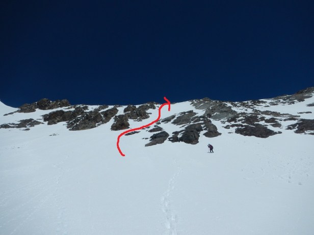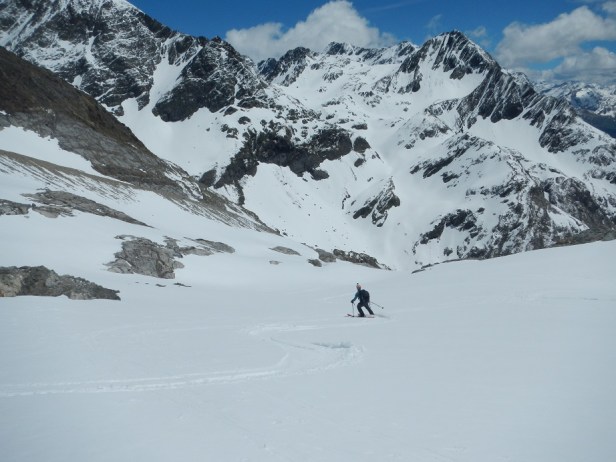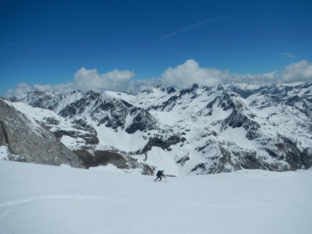 Y luego la pala para llegar a la zona donde dejamos los esquís. Iniciamos el descenso esquiando por amplias palas y pendientes moderadas.