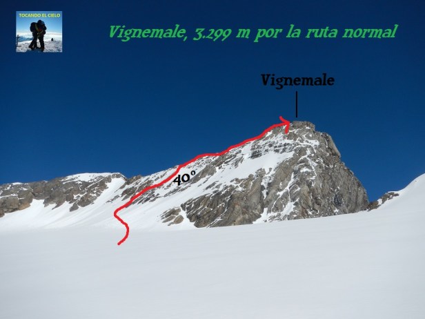 DIFICULTAD ALPINA: F+, pendiente de 40º en la pala que da acceso a la arista cimera.
