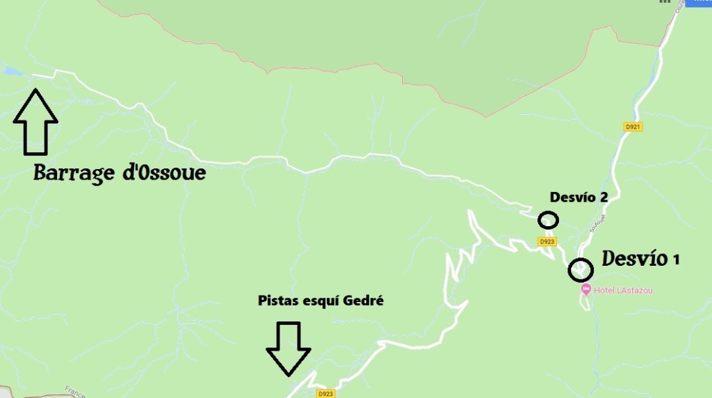 Llegamos a una nueva bifurcación. A la izquierda iríamos a las pistas de esquí de Gedré y el puerto de Bujaruelo. Debemos tomar el desvío de la derecha que nos lleva al barrage d’Ossoue. Indicado.