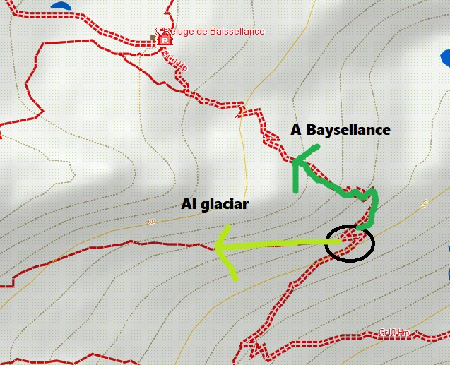 Superado este paso ya estaremos cerca del refugio. Llegamos al punto donde el camino se bifurca, a la izquierda sin sendero está la ruta al glaciar y a la derecha la que lleva al refugio de Baysellance.