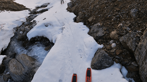 Al final del valle debemos cruzar el río. Hay un puente que nosotros encontramos desmontado, por tanto hubo que buscar el mejor lugar para cruzar, teniendo cuidado con los puentes de nieve avanzada la temporada.