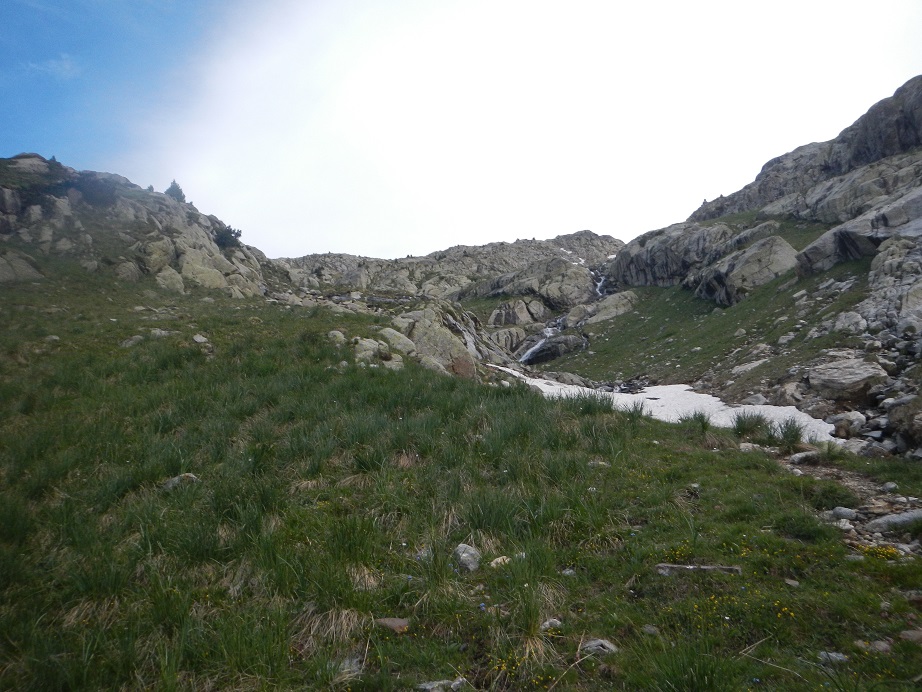 Llegamos a una zona herbosa. Hay que buscar una canal que nos permite descender a la otra vertiente.