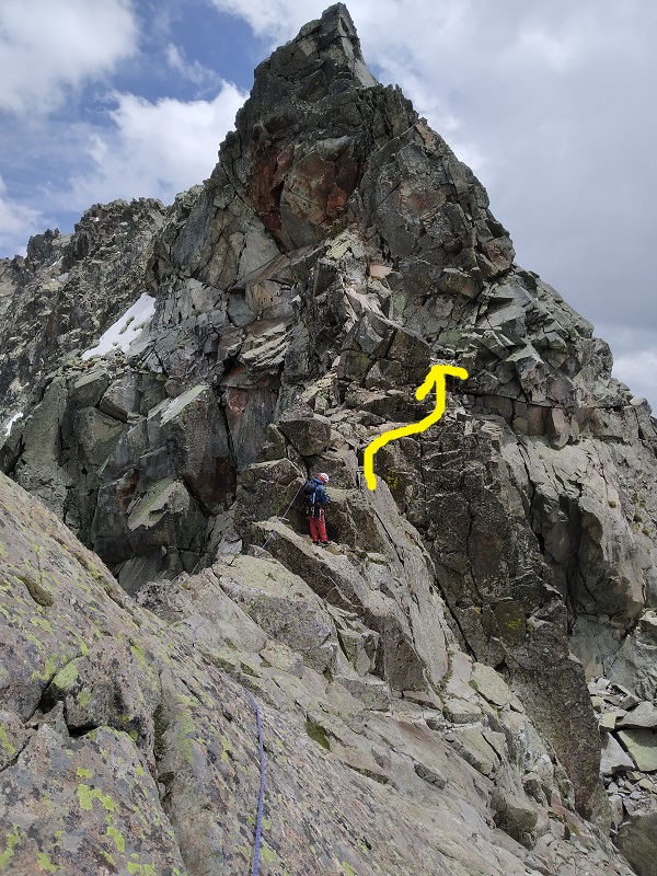 Salimos de la cómoda terraza y montamos de nuevo en la cresta mediante fáciles trepadas por la parte derecha.