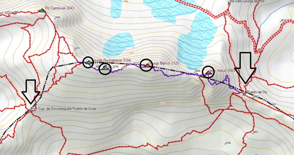 La cresta de Gourgs Blancs está ubicada al norte del Parque Natural Posets Maladeta. Recorre 4 cumbres de más de tres mil metros: