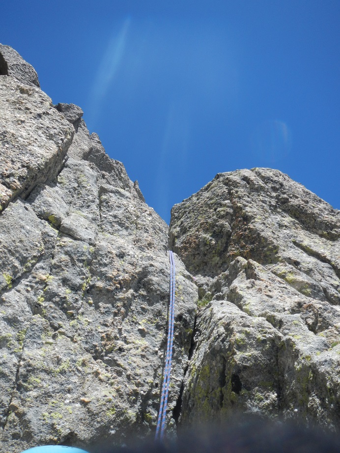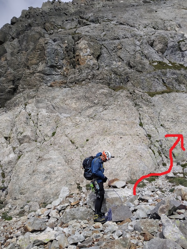 Seguimos hasta llegar a un primer diedro a nuestra izquierda. No ascendemos por este, sino por otro paralelo que está un poco más a la derecha.