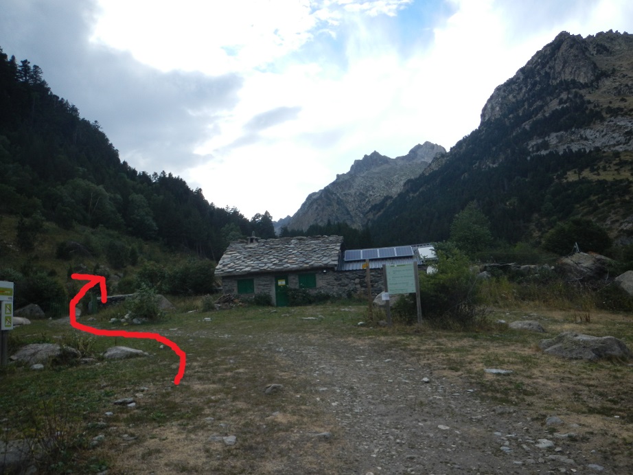 Pasamos por delante del refugio y tomamos un sendero que deja la caseta de los aseos a nuestra derecha.