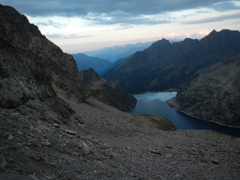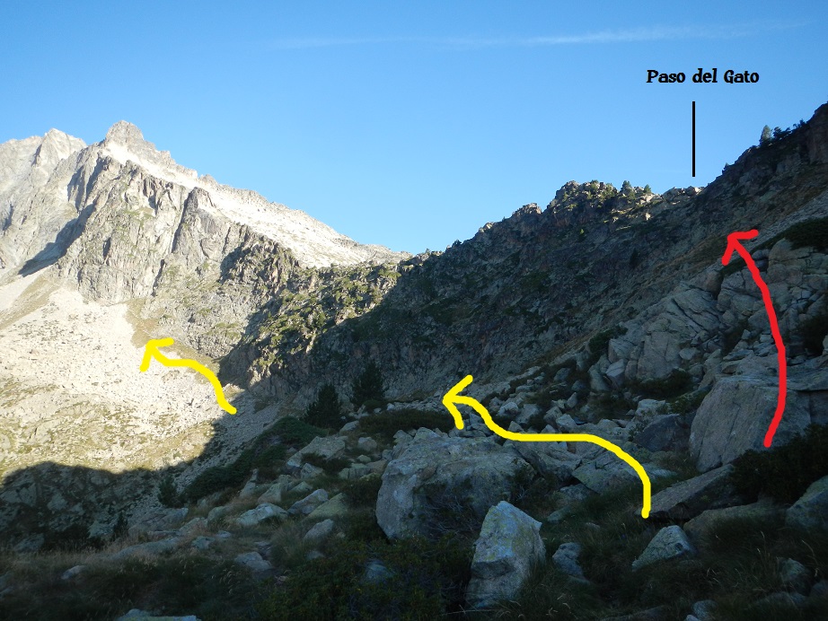 Llegamos a una punto donde unos hitos ascendentes nos llevarían al Paso del Gato, que da acceso al vecino Lac d’Aubert. Nosotros continuamos en ligero descenso dejando el paso a nuestra derecha.