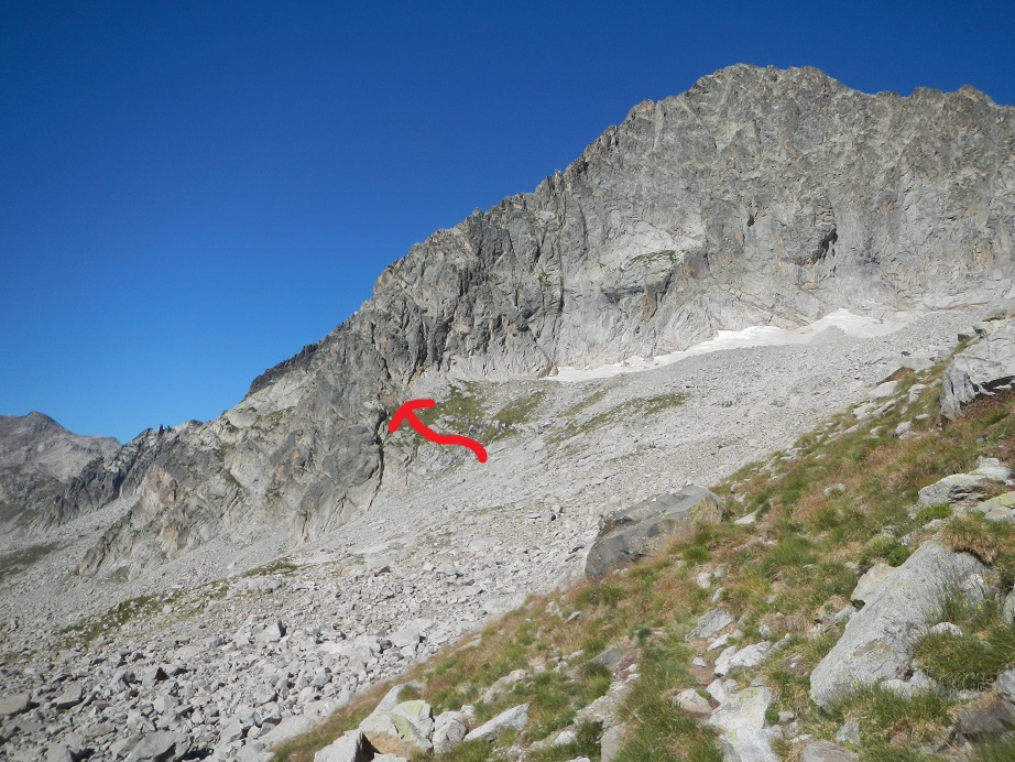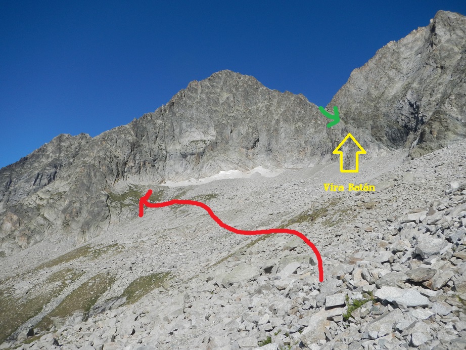 Llegamos a una zona de bloques y nos desviamos a nuestra izquierda en busca de la Arista Ferbos, dejando a la derecha la ruta que nos lleva a la Vira Batán, por donde descenderemos más tarde.
