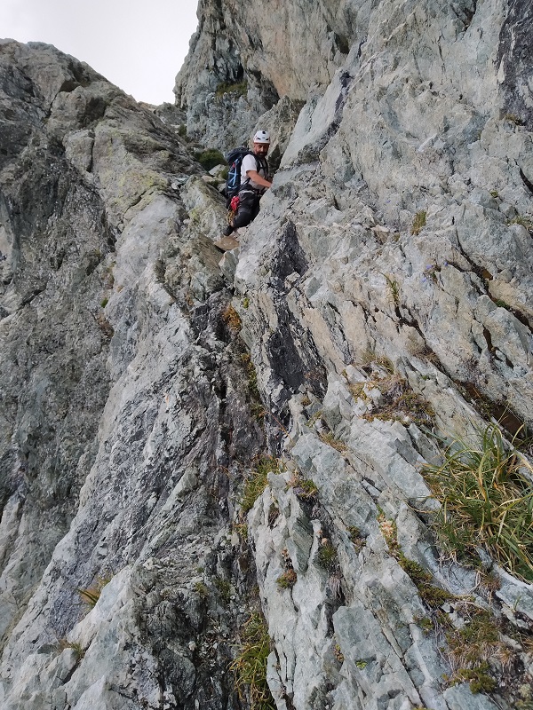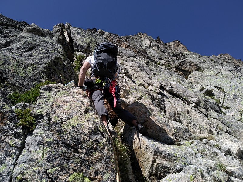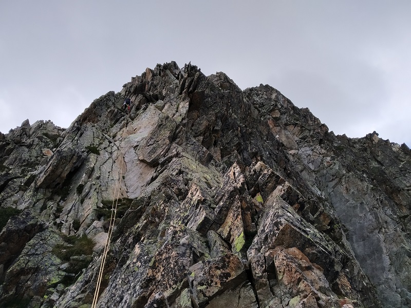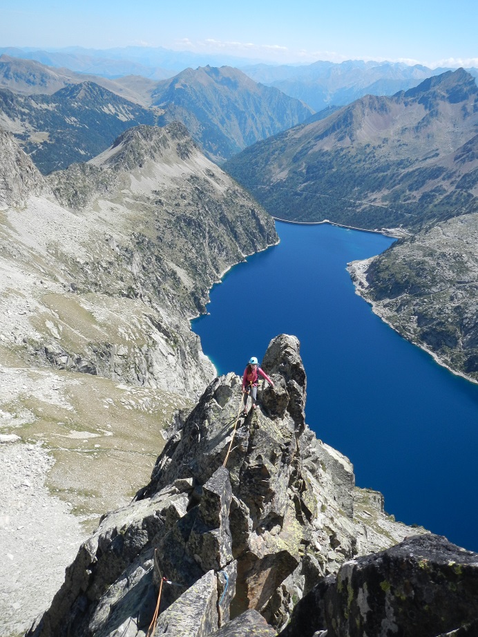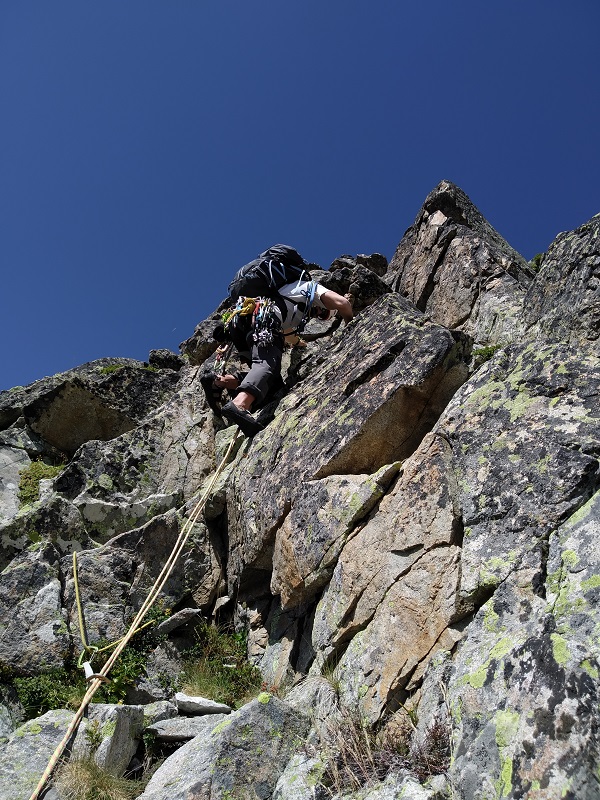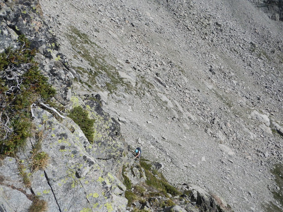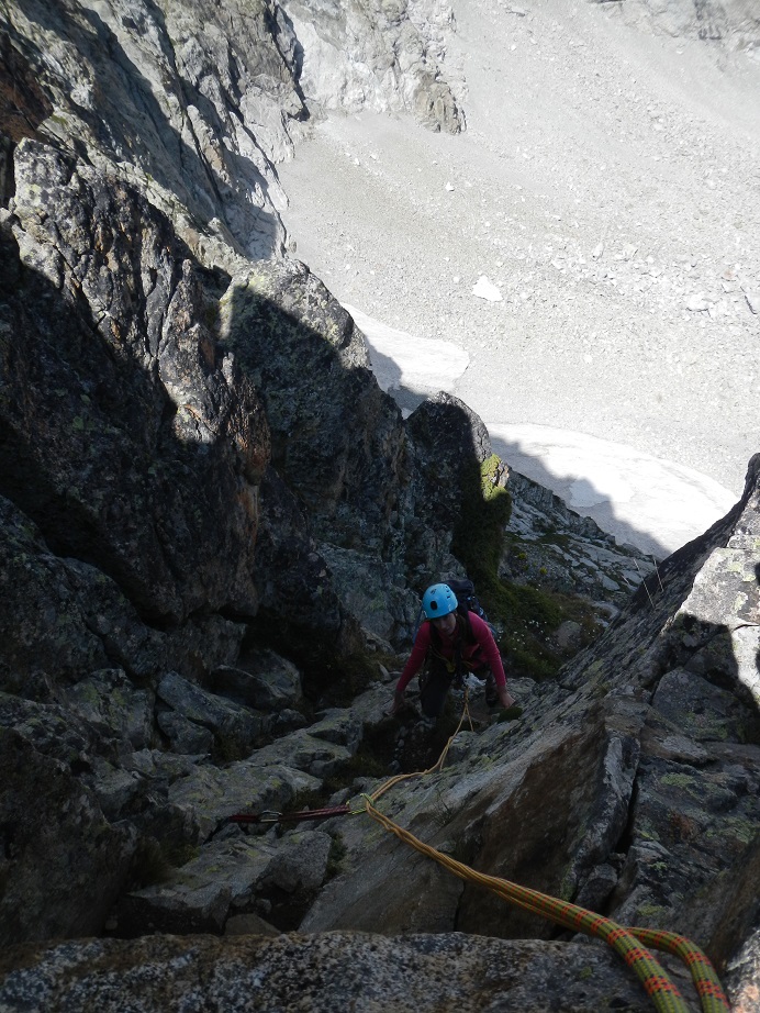 Después de un paso afilado que hacemos en bavaresa, un muro nos corta el paso. Lo evitamos por la derecha por repisas fáciles, hasta llegar a una chimenea de IIº grado para volver de nuevo al filo.