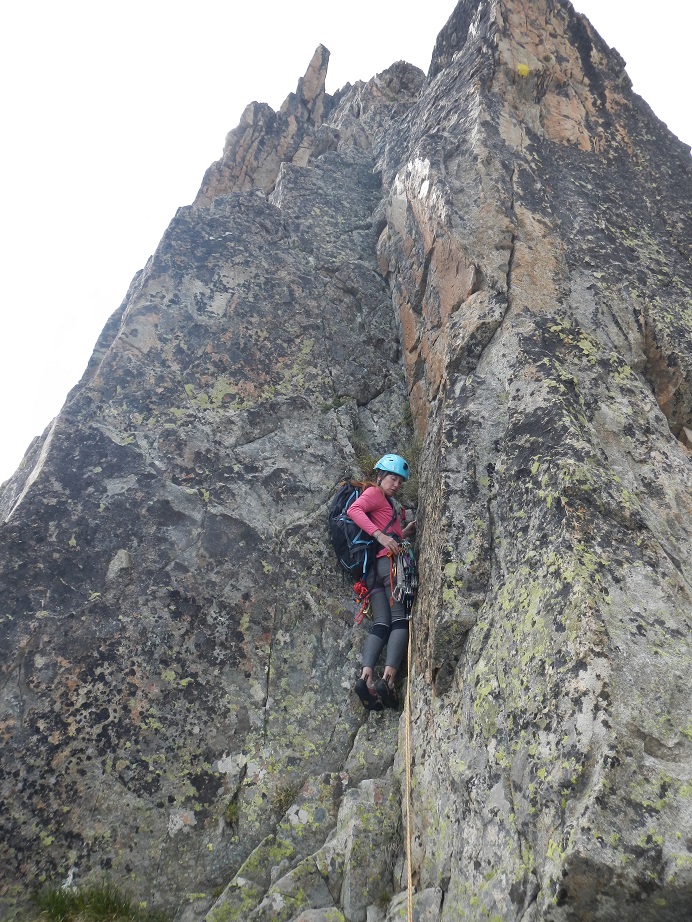 Desde aquí ya podemos ver el diedro de IVº+. Salvamos un nuevo resalte y montamos reunión en un bloque para asegurar el paso más difícil de la arista.