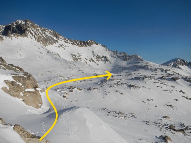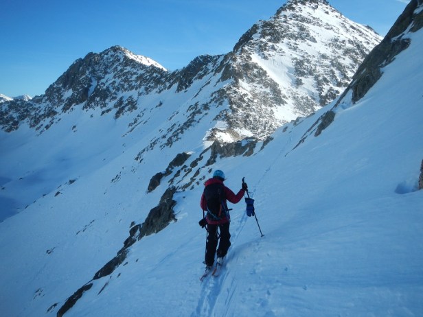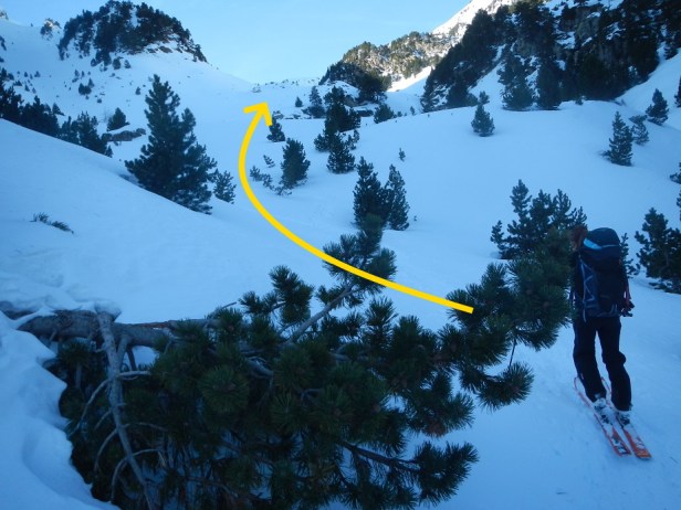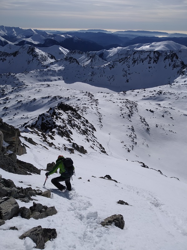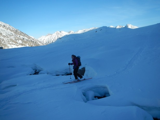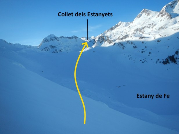 En este punto quitamos pieles y realizamos un breve descenso. Si hay riesgo de placas de viento en cara norte, descendemos en dirección al Estany Fe, sino podremos realizar una pequeña travesía para intentar no perder mucha altura.