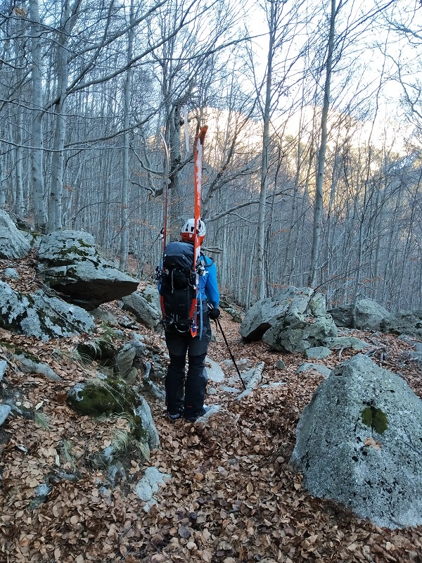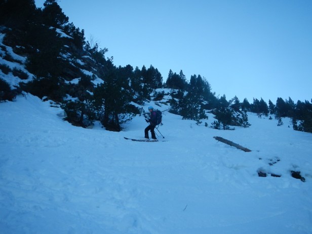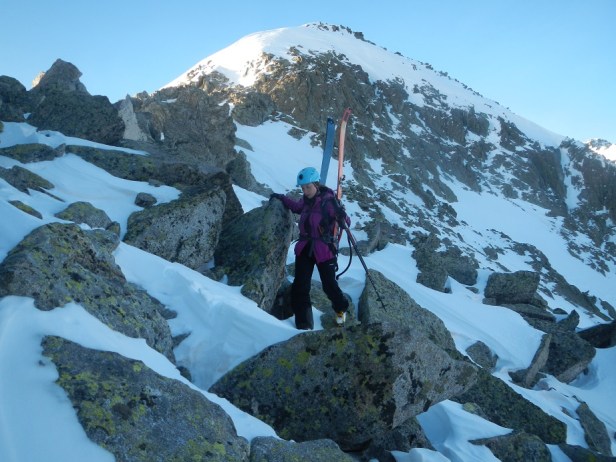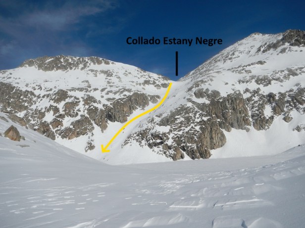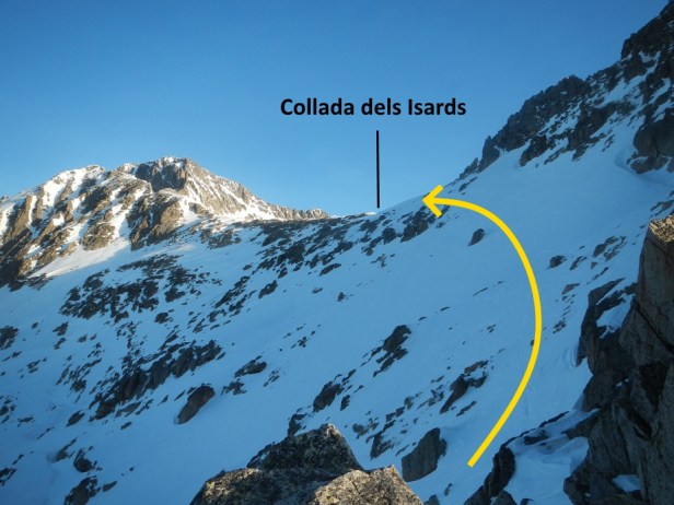 Llegados al collado, quitamos esquís para atravesar una zona rocosa y continuar en dirección a la collada dels Isards.