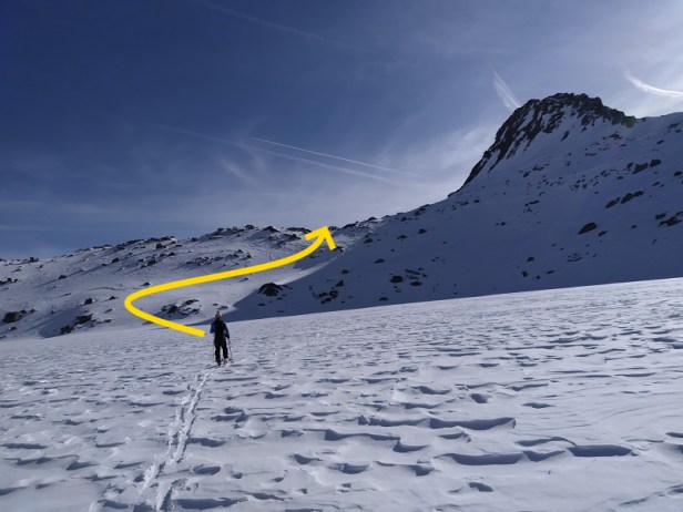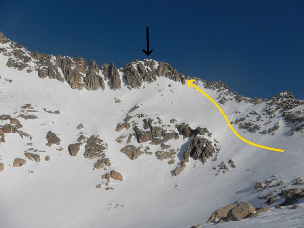 Debemos localizar bien la zona por donde ascenderemos. No hay que llegar a la arista de la derecha.