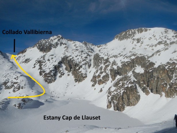Desde el punto donde hemos dejados los esquís en las subida, descendemos en dirección al Estany del Cap de la Vall.