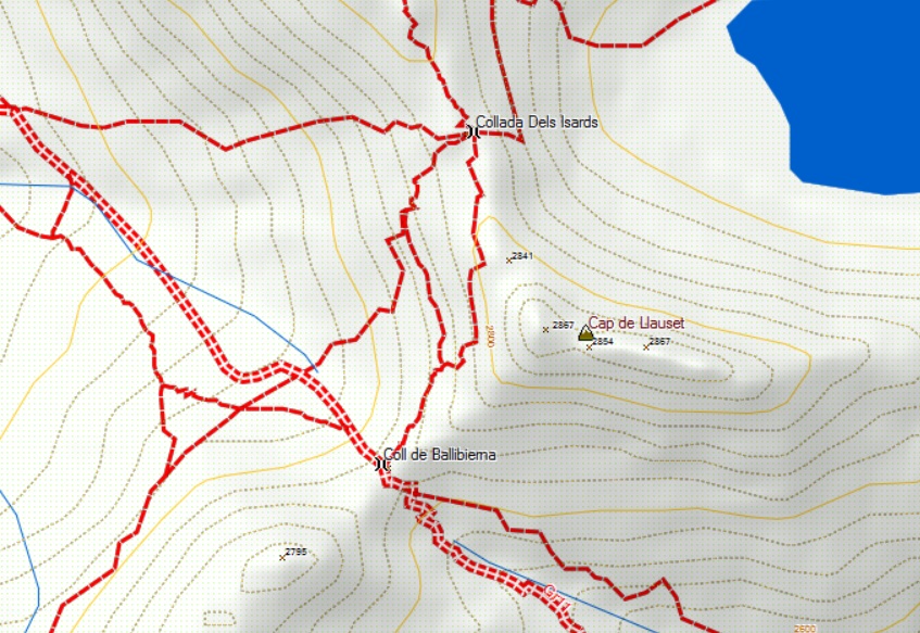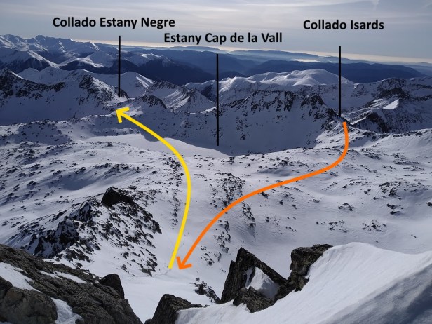Desde la cumbre podemos ver el itinerario que vamos a seguir y el que hemos realizado hasta ahora desde el collado dels Isards.