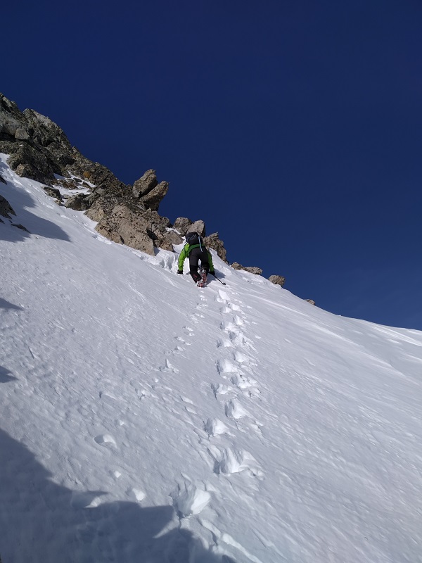 Después del Estany ascendemos una pala que aumenta su inclinación al final y nos obliga a poner crampones.