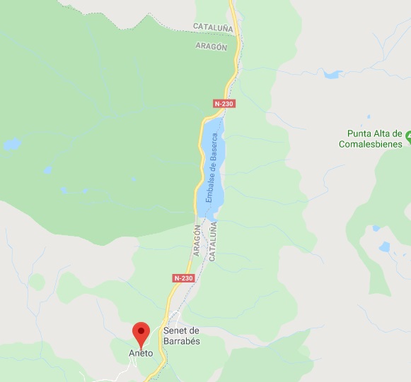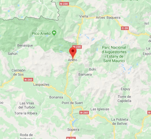 Debemos llegar al pueblo de Aneto, pero sin entrar en el mismo. Seguimos la carretera N-230 en dirección al túnel de Vielha.