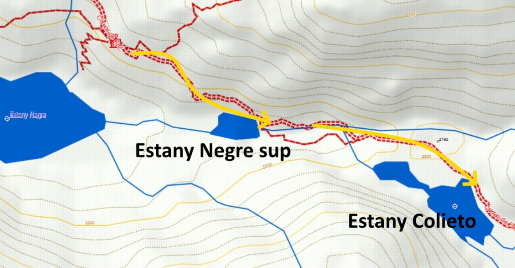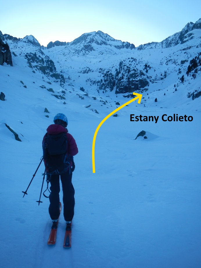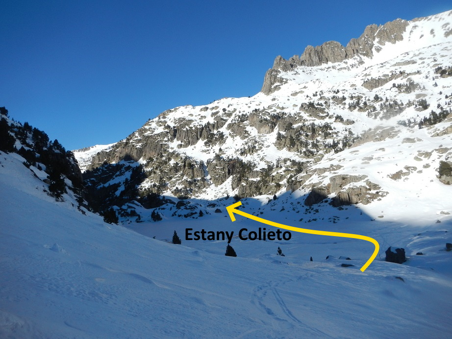Donde calzamos esquís y seguimos en descenso continuo hasta el Estany Colieto.