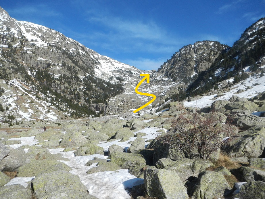 Nuestra ruta se separa de la ruta normal que pasa por el Estany de la Roca, desviándonos a la derecha buscando las pendientes más moderadas.