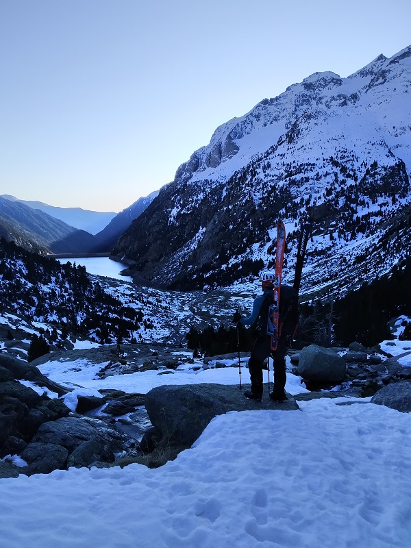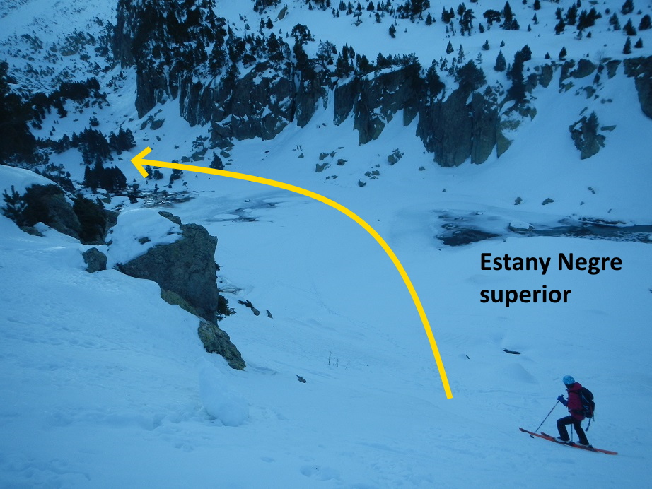 Dejamos el refugio a nuestra izquierda y caminamos unos metros hasta poder calzar esquís para descender con cuidado hasta el Estany Negre superior.