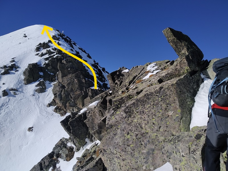 Cuando lleguemos al final del pequeño corredor, todavía tendremos un corto tramo de arista fácil un poco expuesta a nuestra izquierda.