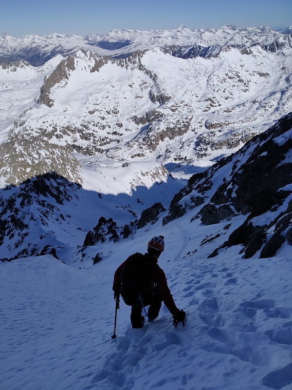 Con cuidado descendemos el pequeño tramo de arista hasta la canal que nos lleva al collado de Arenós.