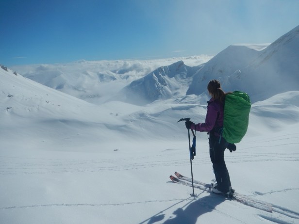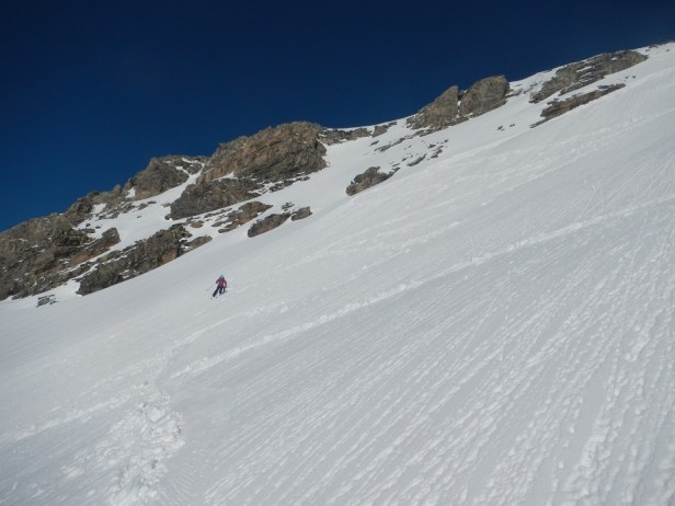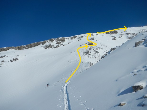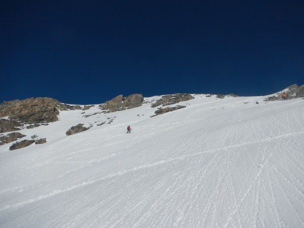 En este punto puede ser necesario el uso de crampones y piolet. En nuestro caso no fue necesario, pero debimos trazar varias zetas.