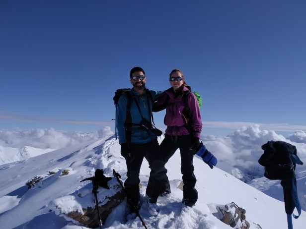 Al fondo ya podemos ver nuestro objetivo. Una pareja abre huella, son los chicos de SOLO QUEDA LO PEOR, con los que charlamos un rato en la cumbre. Os dejamos el enlace de su web, donde podéis ver el bonito video de las ascensión.