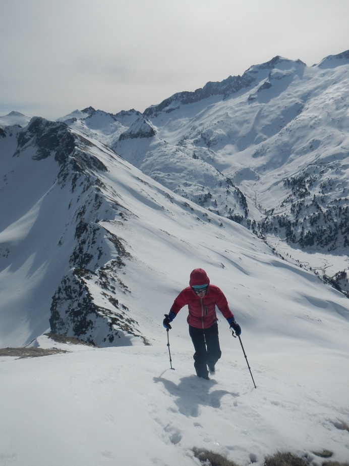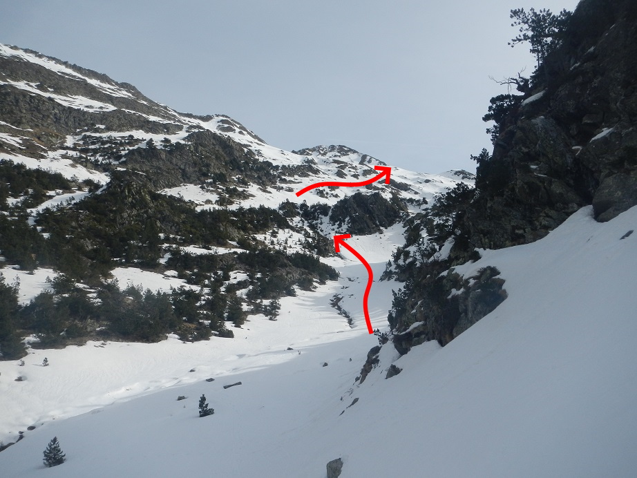 Más adelante nos queda un contrafuerte a nuestra derecha; en este punto debemos descalzar esquís brevemente.