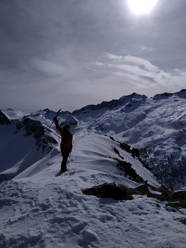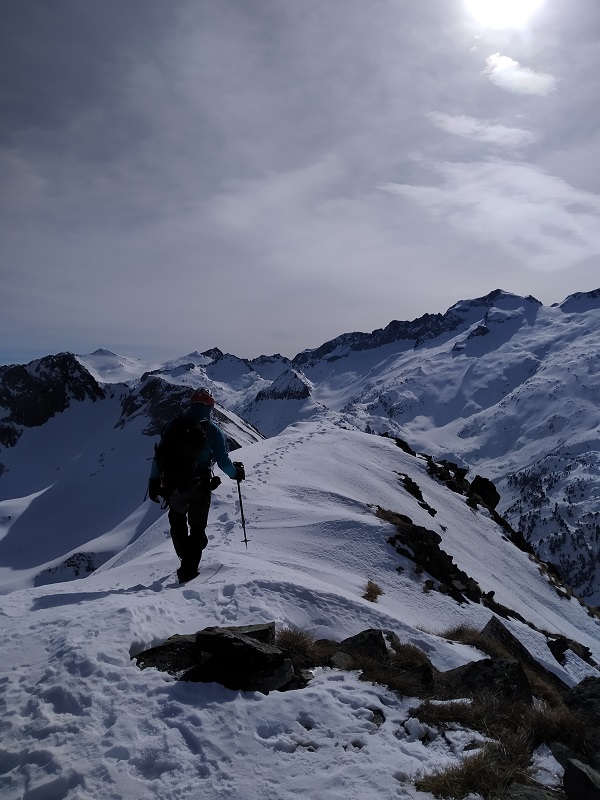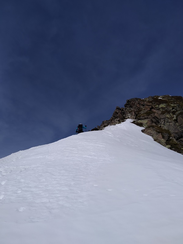 Hasta llegar a la arista cimera, donde descalzamos esquís.