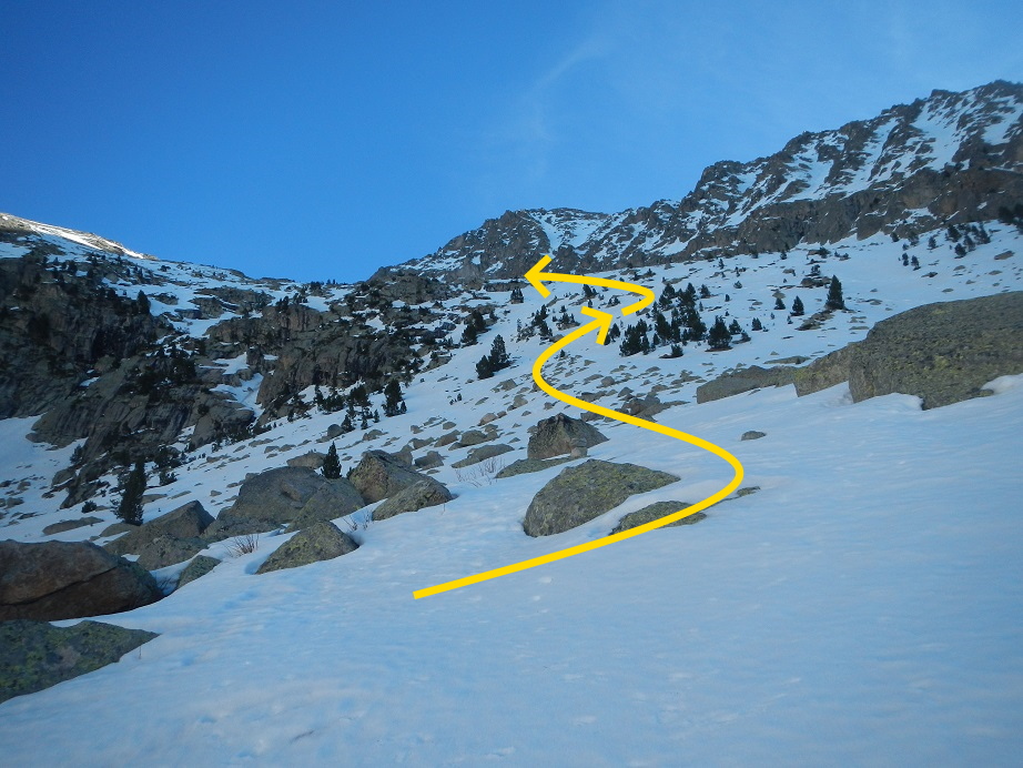 Sin llegar al ibón inferior, trazamos una diagonal a nuestra izquierda, evitando las zonas rocosas.
