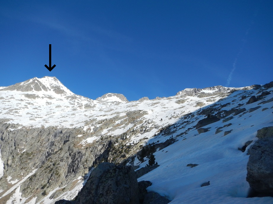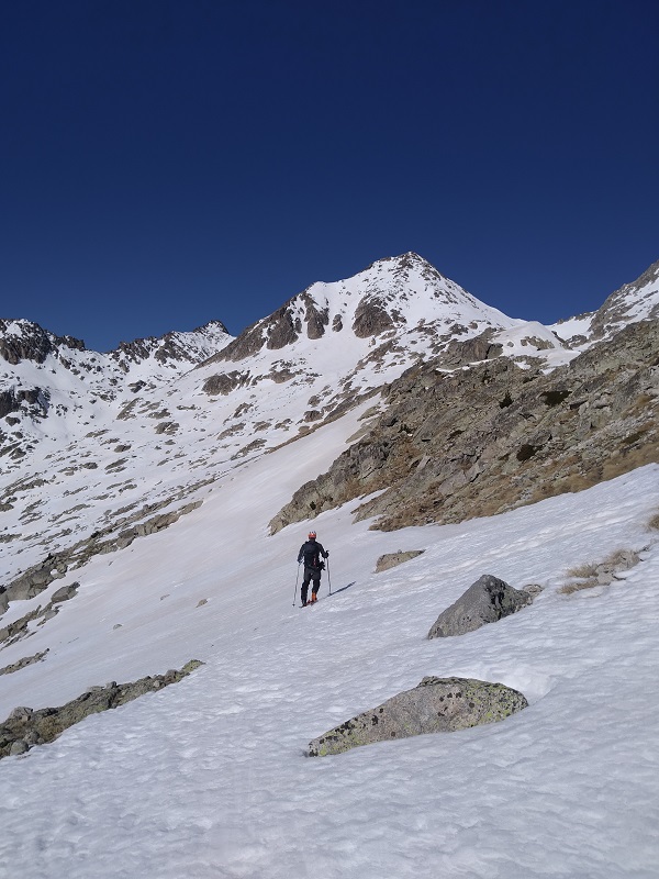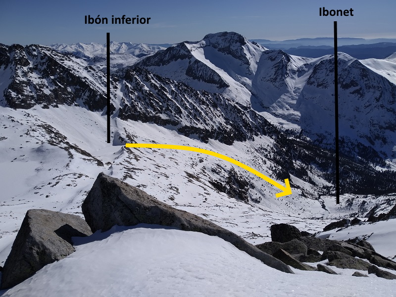 Llegamos al ibonet de Coronas; lo dejamos a nuestra izquierda y ascendemos por pendientes moderadas, con la nieve muy dura a esta hora.