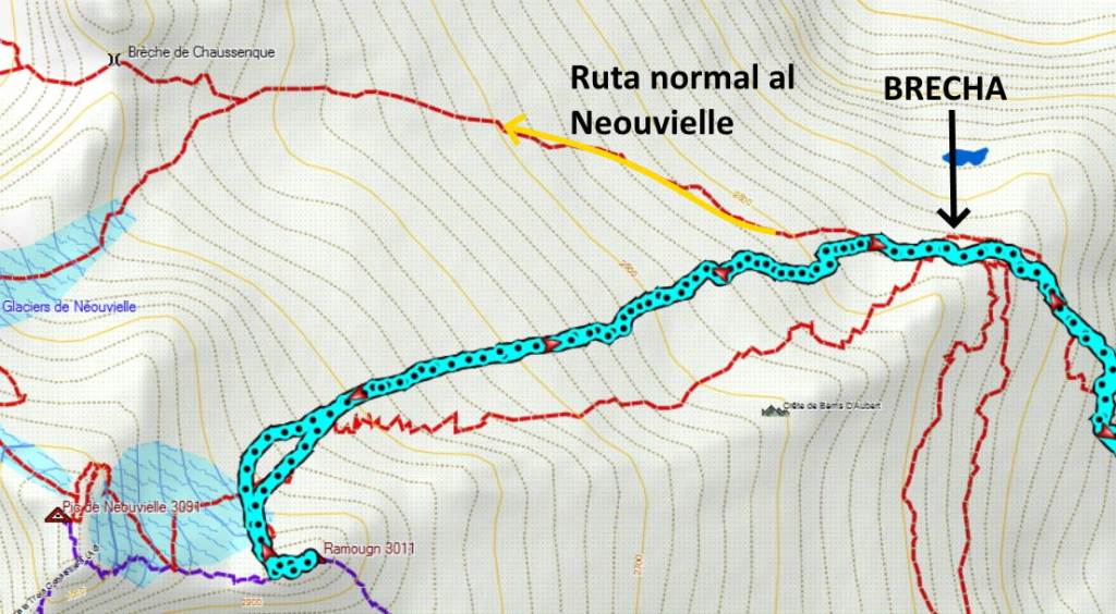 Llegamos a un punto se ven las dos opciones que tenemos para acceder a la cima del Ramougn. En amarillo la nuestra.
