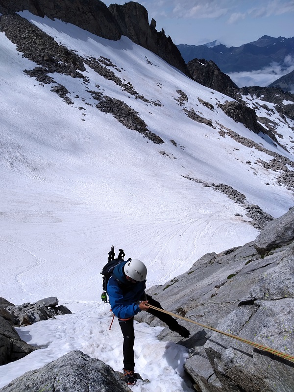 Hacemos un largo de 60 metros y antes de llegar a la arista nos desviamos por una placa tumbada a nuestra izquierda, hasta llegar a una reunión con cintas y maillón, que luego usaremos para rapelar.