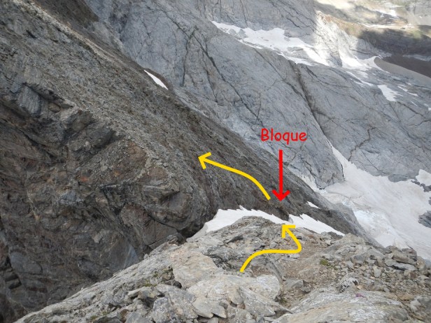 Deberemos descender por terreno descompuesto y con exposición. Encontramos la canal que separa las dos cumbres con nieve dura, por lo que seguiremos por terreno roto hasta ver un bloque característico al otro lado. Cuando lleguemos a su altura cruzaremos con cuidado.